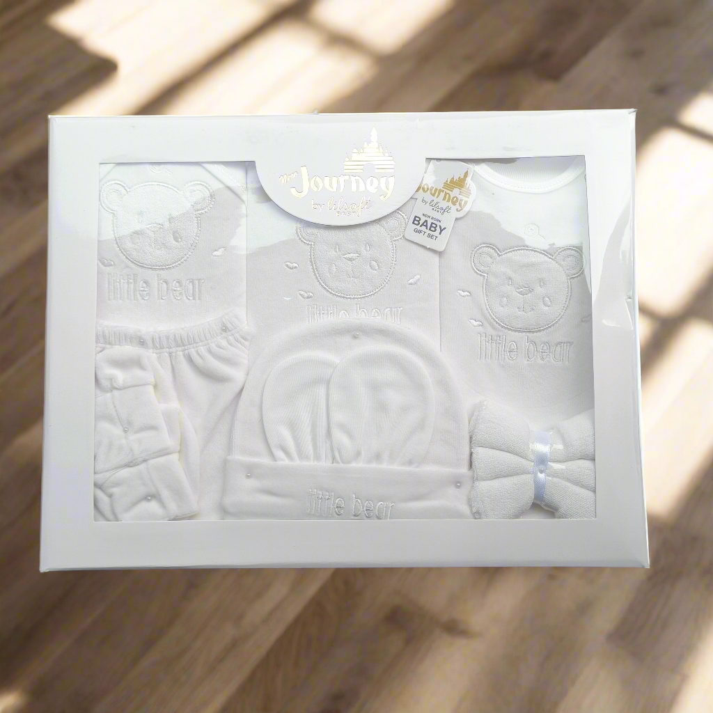 - Contains : T-shirt, Trouser, Bib, Cap, Pair of Booties, body suit, Pair of Mittens & 3 Face Towels