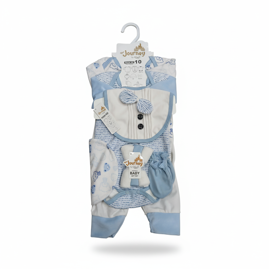 - Contains T-shirt, Trouser, body suit, Bib, Hat, booties, Hanger, 3 face towel