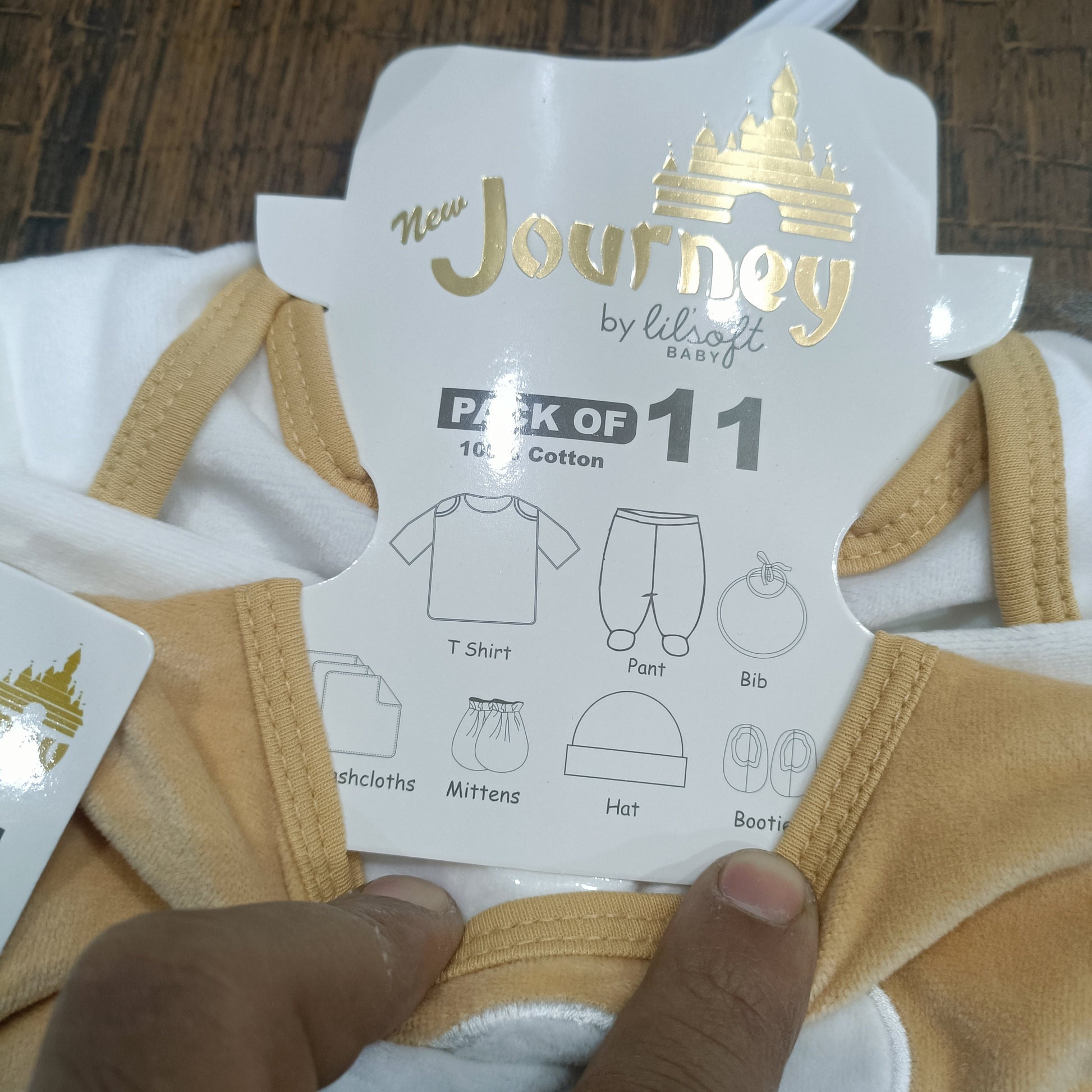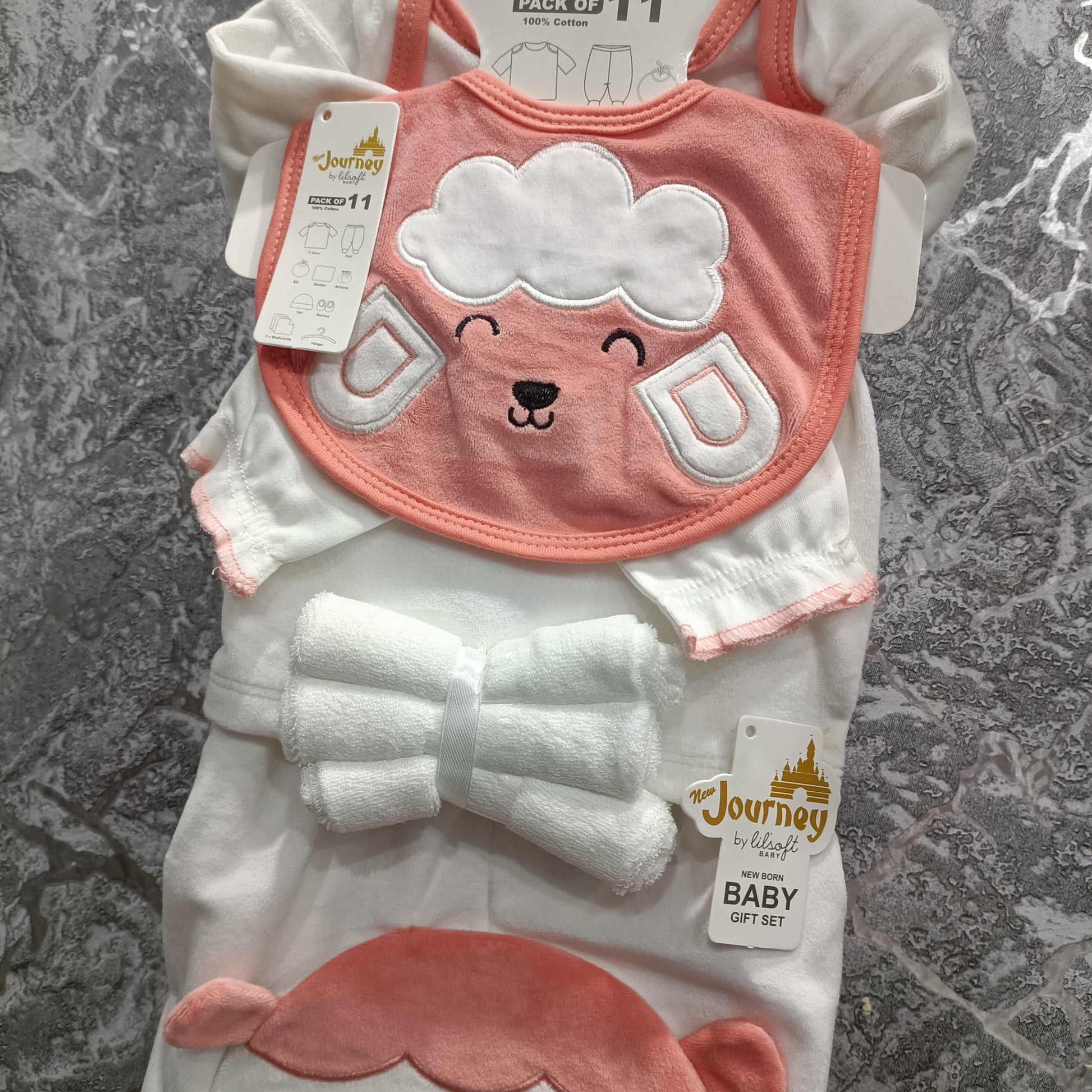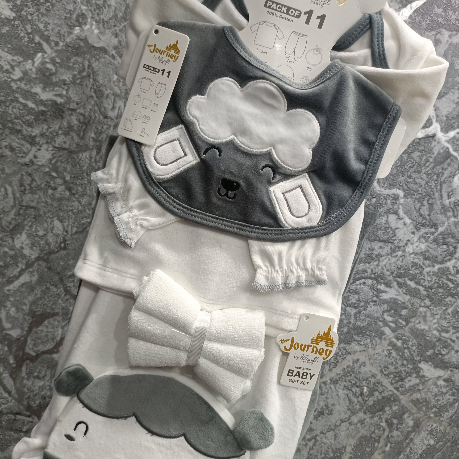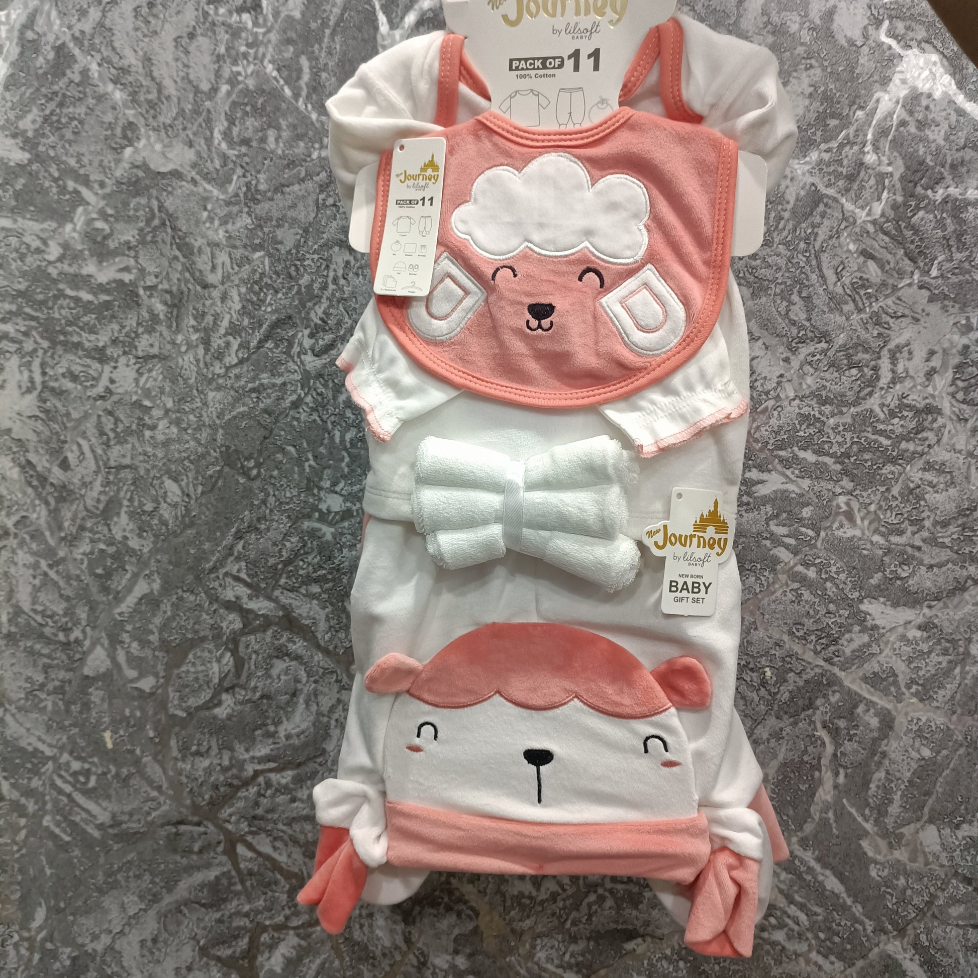 T Shirt. Pant. Mittens. Booties. Hat. Bib. Wrapping sheet. Hanger. 3 face towel